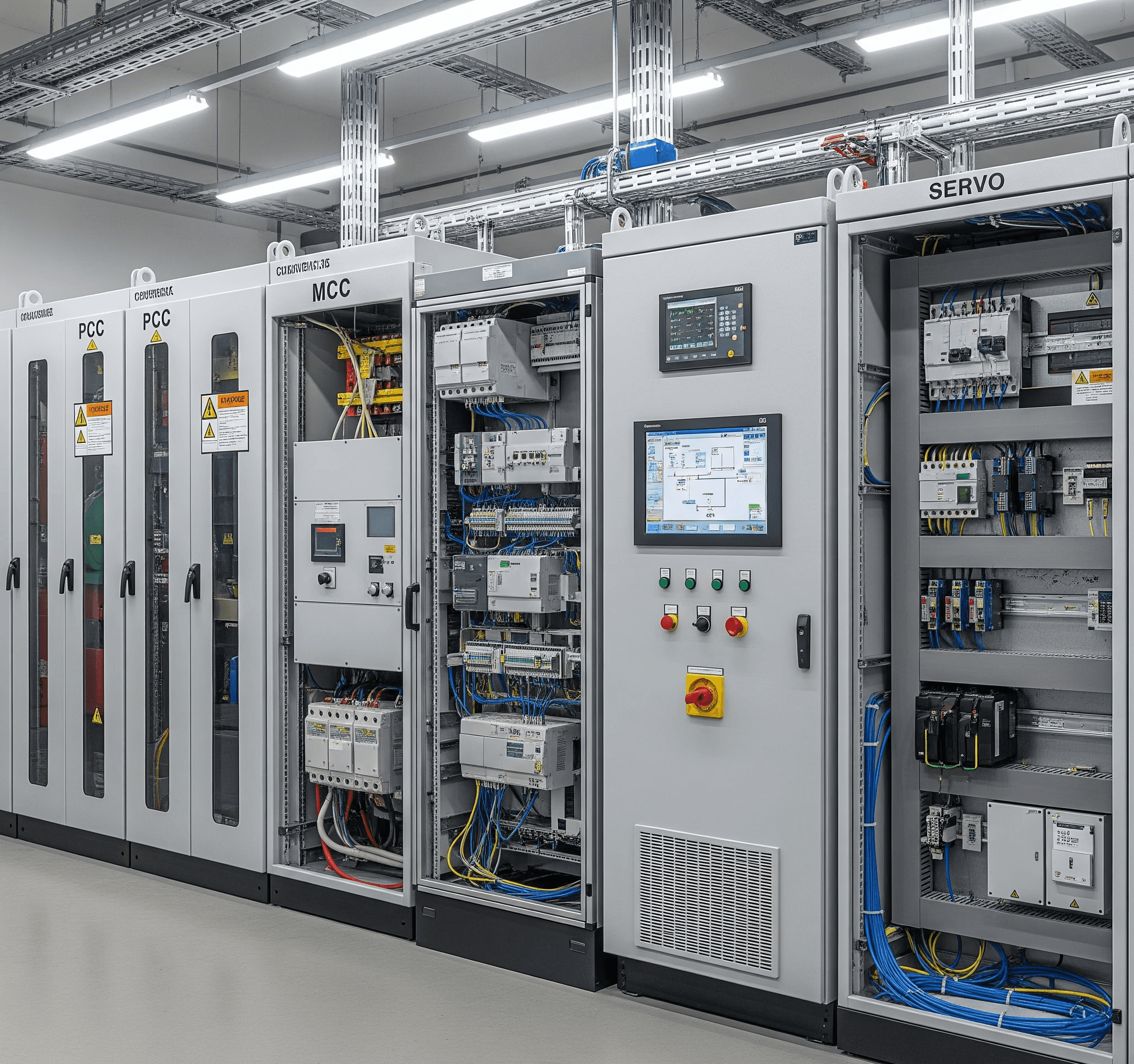 MCC / PCC / PDB / APFC Panels, PLC & CNC Panels, Panel wiring components, Power supplies, relays, MCB/MCCB, terminal blocks.